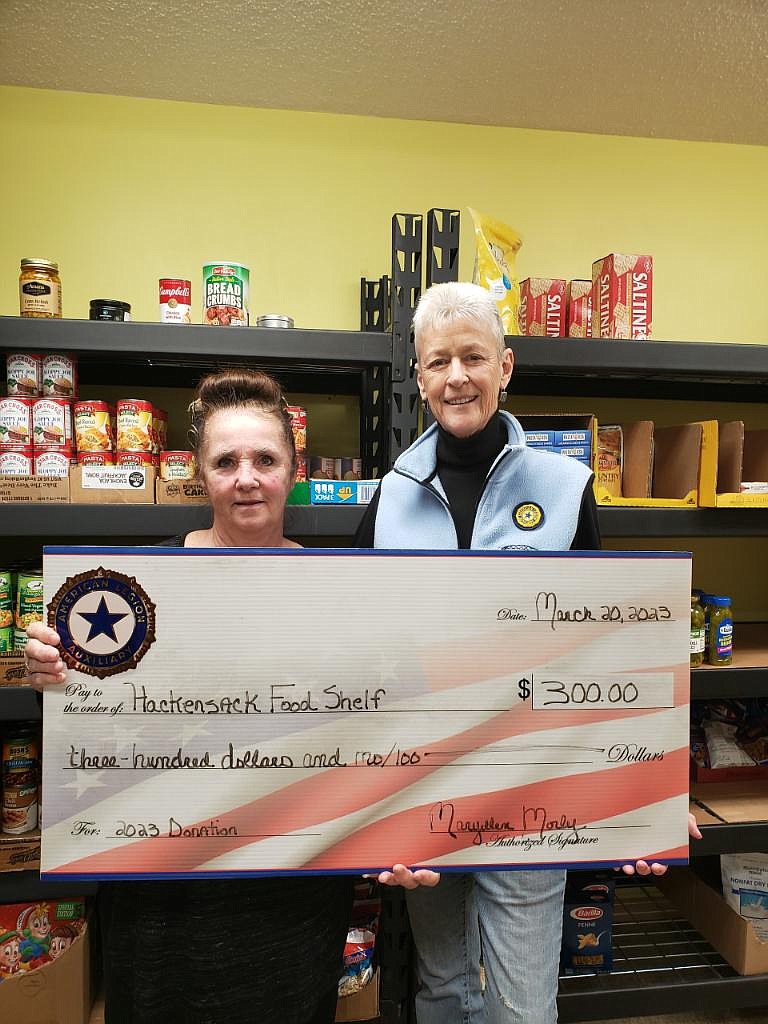 The Hackensack American Legion Auxiliary Unit 202 donated $300 to the Hackensack Area Food Shelf. Cheri Westphal accepted the check for the Food Shelf from Auxiliary member Maryellen Morley. Photo submitted.