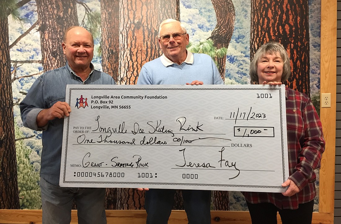 The Longville Area Community Foundation recently awarded a grant in the amount of $1,000 to the Longville Ice Skating Rink. The ice rink is located at Stuart Memorial Park and offers great winter recreation for Longville’s visitors and guests. The ice is regularly maintained and there is a warming house, and skates and hockey equipment available for use. Pictured above: Ed Schultz, LACF President, Craig Anderson with the Longville Ice Skating Rink, and Terry Fay, LACF Treasurer. The LACF awards scholarships to area students for post-secondary education and awards grants to non-profits. The Foundation is dedicated to enriching the community with funds that enhance health and safety, educational, and environmental purposes. Photo submitted.