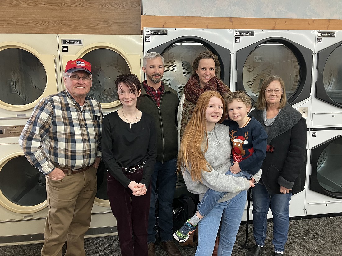 Longtime owners of the Matt’s Laundromat, Lori’s Luvs building Terry and Lori Daudt located on the corner of Co. Rd. 5 and State 84 have passed the reins to new owners Dan and Heike Johnson. Pictured above from left is Terry Daudt, McKenna, Dan, Heike, Sofia and Oscar Johnson and Lori Daudt. Dan retired from the Air Force after 22 years and he and his family moved to the Longville area in 2022. The laundromat has been renamed Turtle Town Laundry, the Longville Lakes Arts Alliance now occupies the location of Lori’s Luvs, Remax will remain in its current location and another approximately 600 sq. ft. is available for rent. Photo by Dave DeLost.