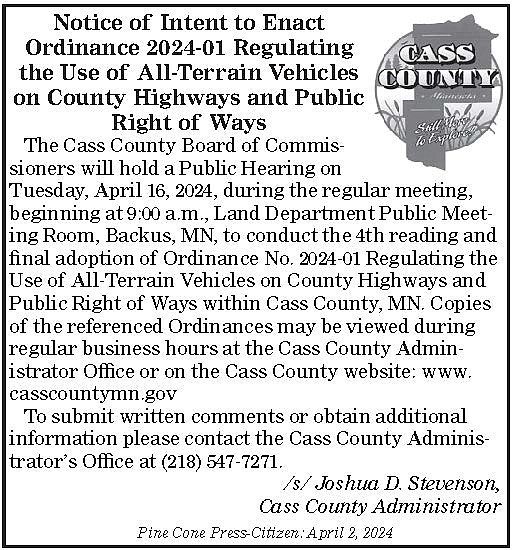 Cass Co - Intent to Enact ATV Ord. 4-2-24