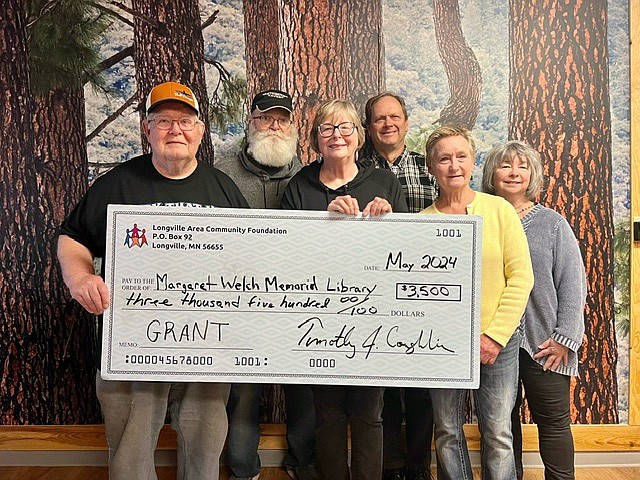 The Margaret Welch Memorial Library recently completed the new addition and is ready for summer fun! The Longville Area Community Foundation was pleased to present the library a grant in the amount of $3,500. These funds will be used for furnishings in the new space. The Longville Library was established in 1955 and is the smallest town in Minnesota to have a public library. The updated space will enhance the service and experience for the thousands of patrons who utilize the library as well as improve space for special projects, story time and craft programs offered for visiting summer families and children. Pictured are left to right: Tom Kutschied LACF Board Member, Larry Jensen LACF Grant Liaison, Phyllis Eck representing the Library Board, Tim Coughlin LACF Treasurer, Patty Nypower LACF Secretary/ Scholarship Liaison, and Terry Fay LACF President. Photo submitted.