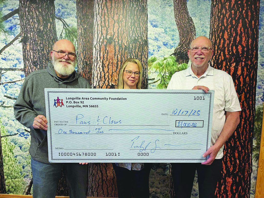 The Longville Community Foundation and an anonymous donor funded a $1,000 grant to Paws + Claws Rescue and Resort. Funds will be used to provide care for the animals until they are adopted into their forever home. Are you ready for a new addition to your family? For more information go to: pawsandclawsrr.org, or call: (218) 675-7297. Pictured are L to R: Larry Jensen - Grant Liaison, Melanie Mix and Jim Moravek. Photo submitted.