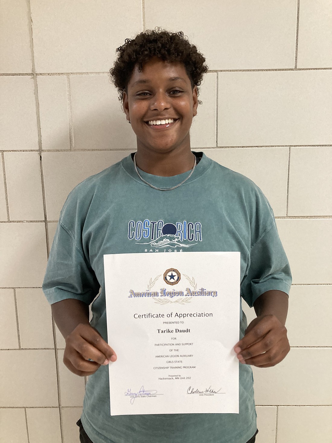 Tarike Daudt from the WHA School campus participated in the 78th Annual American Legion Auxiliary Minnesota Girls State Program. This is a premier program in citizenship for young women. It is one of the most respected experiential learning programs in the United States. The program epitomizes the ALA’s mission to honor those who have brought us our freedom by continuing to train young women to be leaders grounded in Patriotism and Americanism. Tarike spent June 15th-21st at Bethel University in Saint Paul. Photo submitted.