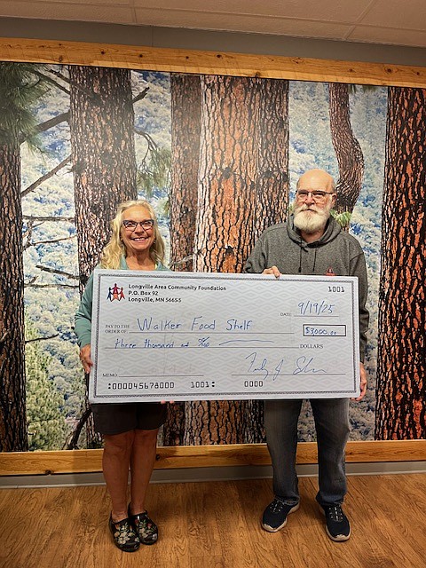 The Walker Area Food Shelf has received a $3,000 grant from the Longville Area Community Foundation. The funds will support programs that address food insecurity among seniors, youth and working families in the area. Board member Terri Fierstine (pictured left) accepted the check from Larry Jensen, grant liaison for the Foundation.