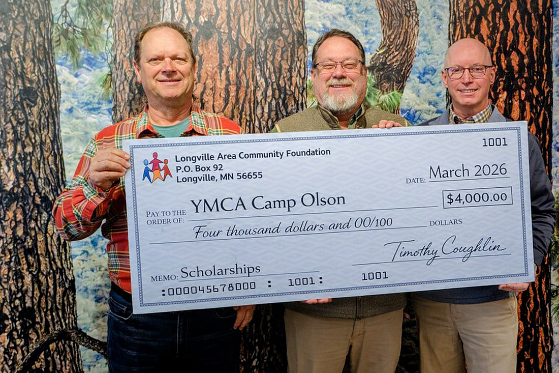 The Longville Area Community Foundation recently donated $4,000 to the YMCA Camp Olson. Pictured from left is Tim Coughlin (LACF), John Lyon (YMCA), Bill Hansen (LACF). Photo Submitted.